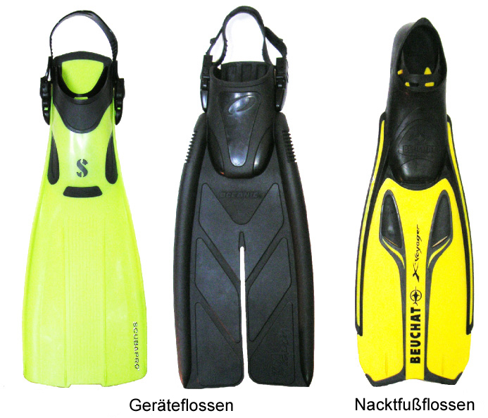 Zum einen gibt es die Nacktfußflossen, die auch als Schwimmbadflossen oder Trainingsflossen bezeichnet werden. Diese Art von Flossen dürfte vielen bereits in der Jugend begegnet sein. Wie der Name schon sagt, werden sie mit nackten Füßen getragen. Nacktfußflossen eignen sich nicht für das Tauchen im Freiwasser. Da der Fuß nicht isoliert ist besteht zum einen eine hohe Verletzungsgefahr, da der Weg in und aus dem Wasser Barfuß erfolgt. Zum anderen ist der Wärmeverlust das maßgebende Kriterium für die Nichtverwendung im Freiwasser. Nacktfußflossen werden gern bei der Tauchausbildung im Schwimmbad verwendet.