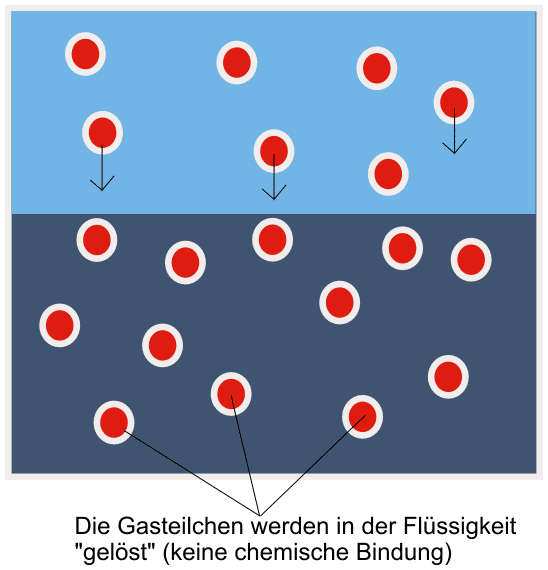 Bei konstanter Temperatur steht die Menge des in der Flüssigkeit gelösten Gases im Sättigungszustand in direktem Verhältnis zum Druck des über der Flüssigkeit stehenden Gases.