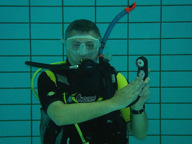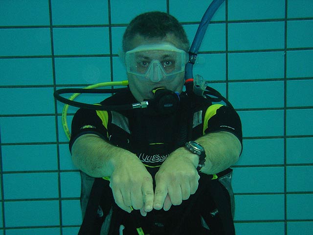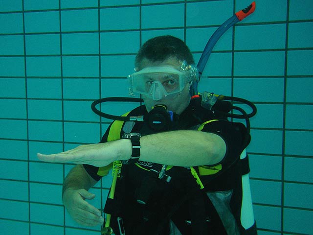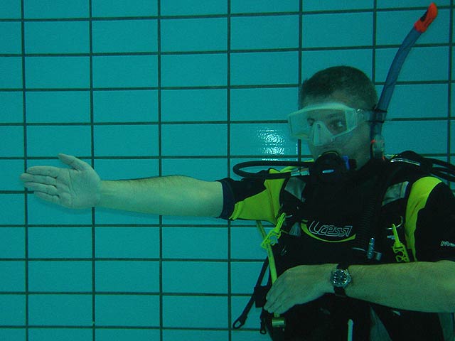 Um z.B. die Richtung, in die getaucht werden soll anzuzeigen, zeigt der Arm mit ausgestreckter Hand in diese Richtung.