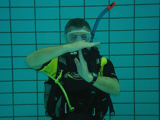 Eine ausgestreckte Hand die in einer Linie mit dem Unterarm ist signalisiert, dass die aktuelle Tauchtiefe gehalten werden soll.
